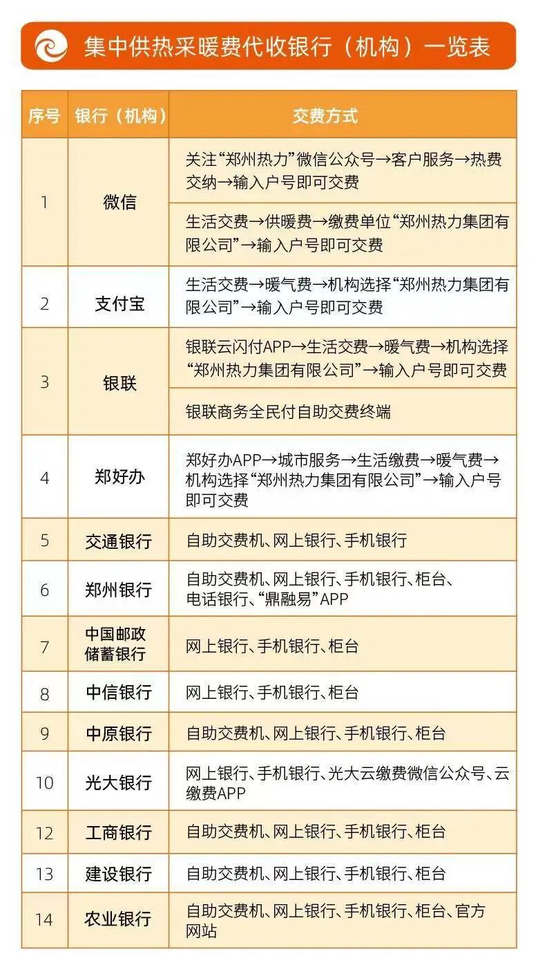此外,热费代收机构也开启收费模式,用户可持城市集中供热用户交费卡到交通银行、中信银行、郑州银行、中国邮政储蓄银行、工商银行、中原银行、光大银行、建设银行、农业银行等9家银行代收机构交费。